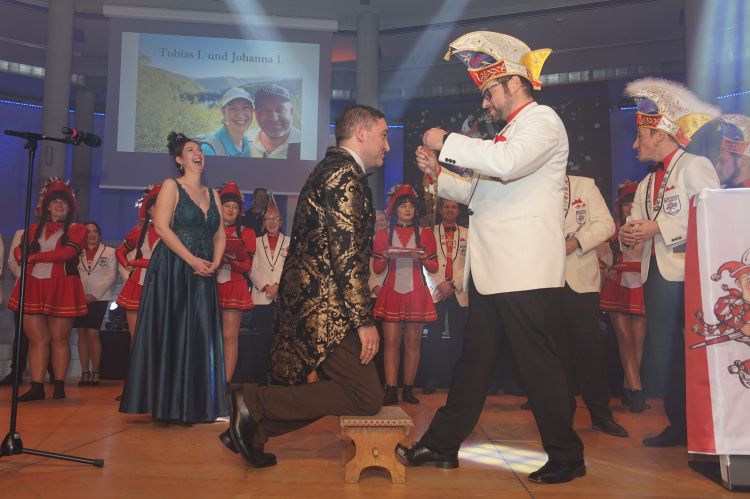 Die drei Vorsitzenden übergaben die Insignien der Macht, Ortsbürgermeister Reiner Hör den Rathausschlüssel und Ex-Prinzessin Anna.Maria legte der der neuen Prinzessin die gesponserten Kronjuwelen an. Nach der Begrüßungsrede an die Untertanen und der Ankündigung, den Thron in den Sitzungssaal des Rathauses zu stellen und ihrem Ehrentanz durften die beiden den Gratulationsreigen genießen.
