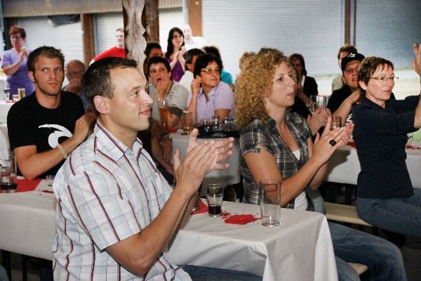 Zum kulturellen Höhepunkt des Abends avancierte ein Spontanchor des Beirats, der mit flotten Melodien die Verdienste und die Marotten des gefeierten Paares parodierte. Eric und Simone waren mächtig überrascht über die detailierten Indiskretionen, denen sich die SängerInnen bedienten. Unter der musikalischen Leitung des Großmeisters am Keyboard, Herbert Brugger, brachten die sechs Damen und Herren gefällige Melodien gut zum Gehör. Frenetische Zugabe Rufe schienen jedoch, aus Mangel an Vergleichbarem, etwas überspitzt.