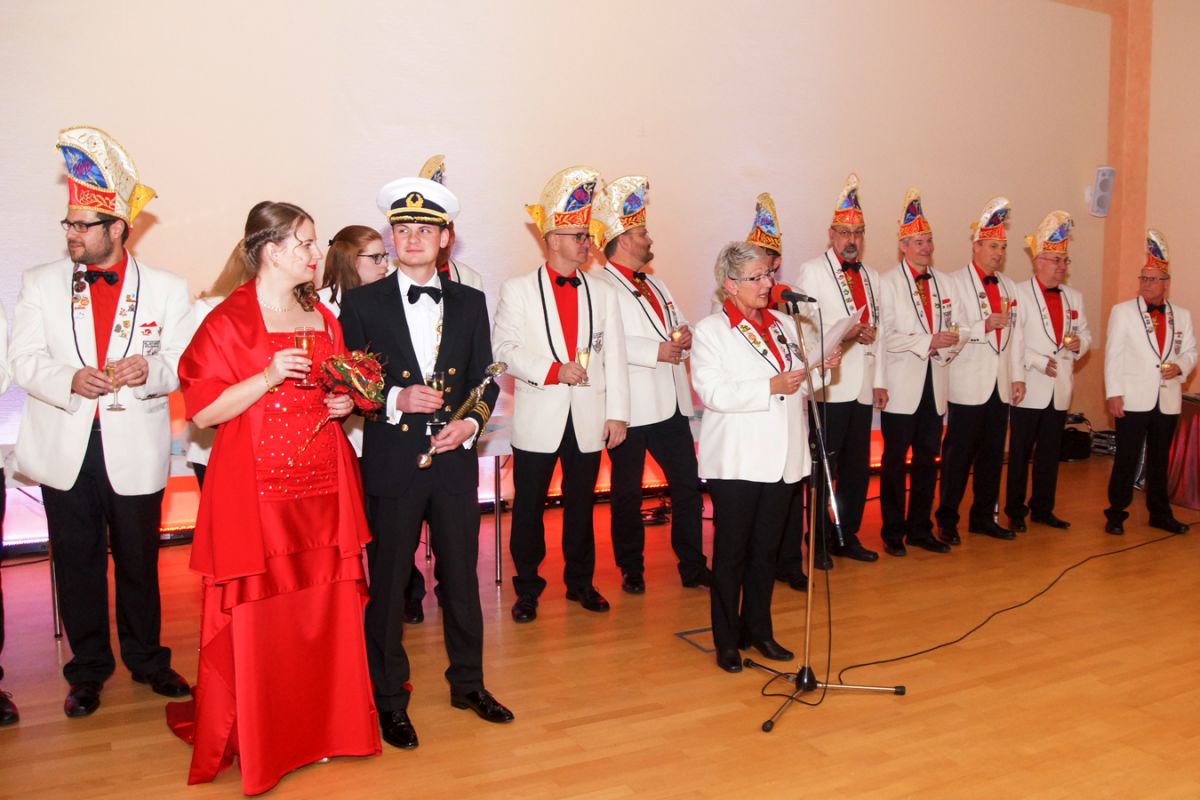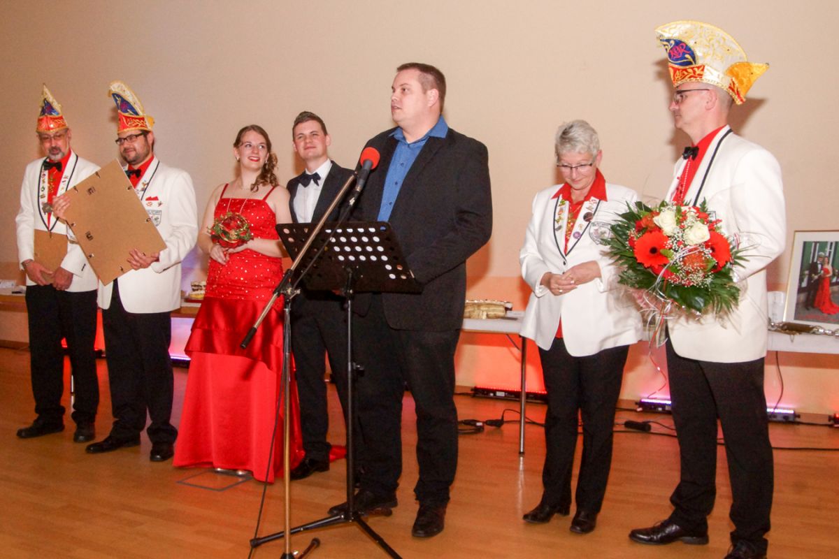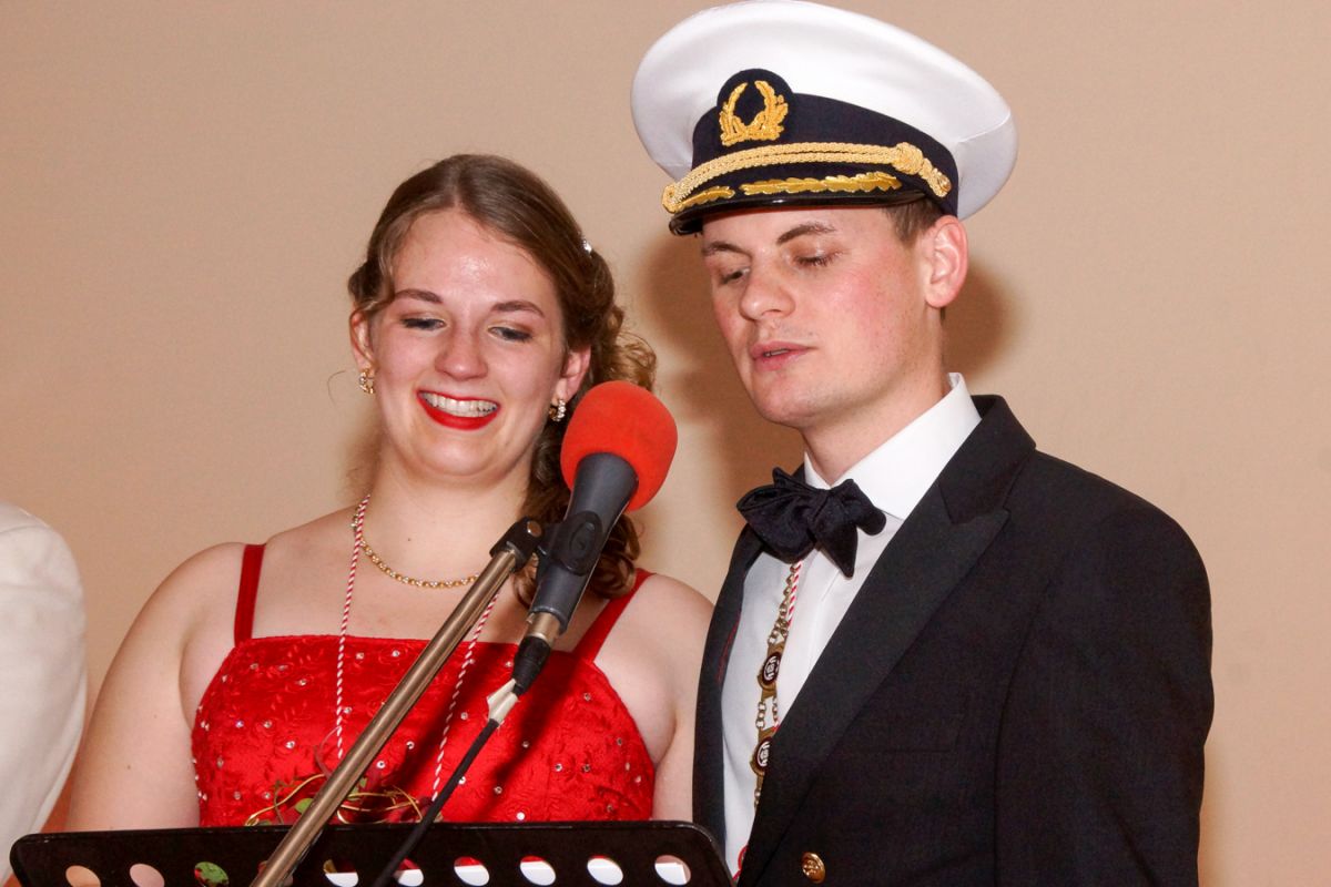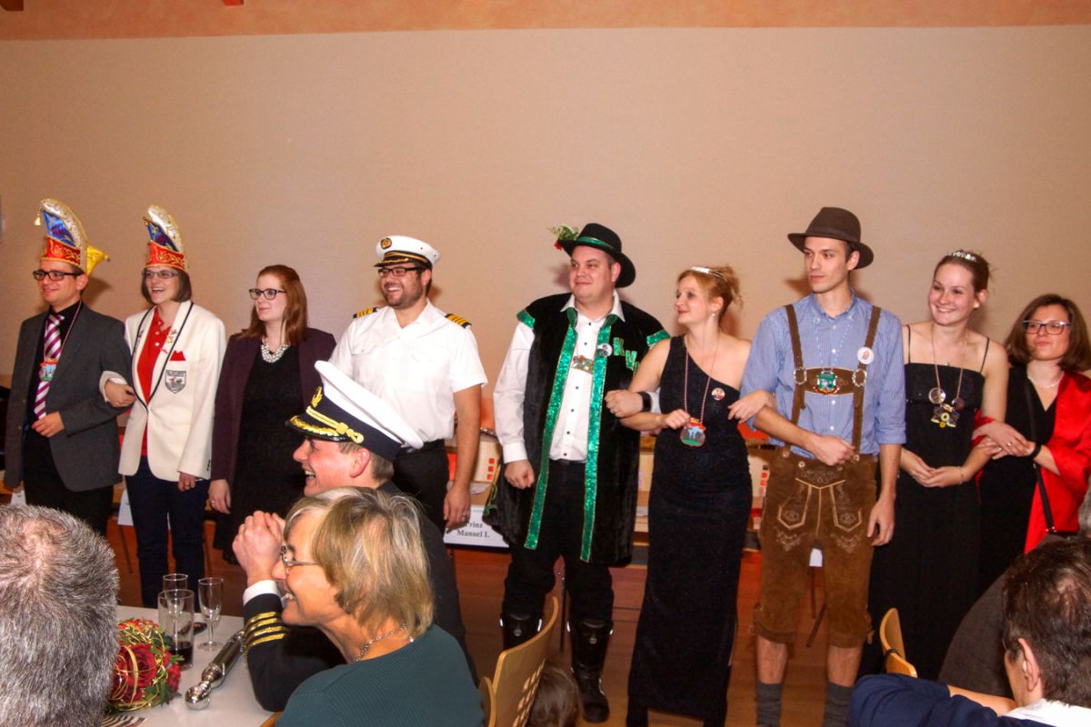 Dann wehte amerikanisches Flair durch den Saal, als Sebastian Hör mit seiner neuen Figur „Donald Trumpel“ in der Bütt stand. Danach präsentierten mehrere KGR-Aktive unter großem Gelächter im Saal ihre Version des „Dinner for One“, das sie schon am Prinzenfest aufgeführt hatten, bevor am Ende Prinzessin Lisa I. und Prinz Manuel I. die Insignien der Macht zurückgaben und ihren wohlverdienten Ruhestand antraten.