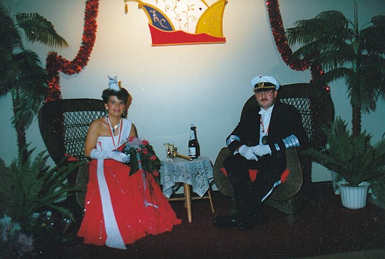 "Henri I von Frankonesien, aus dem Geschlecht der Musikfranken und Hintere Grabengässler, Graf zu Chorauen, Chef Südpfälzischer Staatsopernchöre, Träger des goldenen Teleskopdirigentenstabes mit Noten und Girlanden, Ehrenkapitän des KGR-Traumschiffs "Klingbach", Sproß vom weltberühmten Rülzheimer Tanz-College "Frank-Dancers" und Beate I von Frankonesien, Freifrau zu Jantzerburg, aus dem Geschlecht der Hinteren Grabengässler und Lämerscher Wasserhinkle, Tabakprinzessin des Baumfällerkönigs Eugen dem Starken von der Axt und zu Kettensäge" lautet der klangvolle Name des närrischen Prinzenpaares, das die Gemeinde Rülzheim bis zum Aschermittwoch regieren wird.