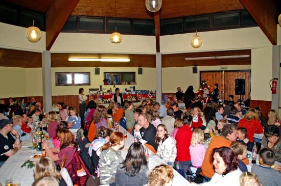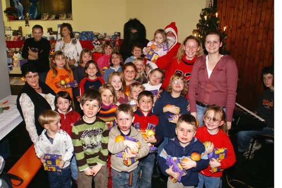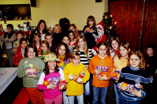 Das Wirtschaftsteam hatte alle Hände voll zu tun, die hungrige Meute satt zu kriegen. Aber dann kam er: Der Nikolaus mit seinem Knecht Rupprecht. Erst spielte er für die Kinder ein nettes Weihnachtslied, dann teilte er seine Geschenke aus. Er vergaß aber nicht Lob und Tadel auszuteilen. Informiert von der 2. Vorsitzenden Ursula Wolff, kannte er viele Internas. Sicher wäre auch so manches Wort an die Erwachsenen zu richten, aber schließlich war er ja gekommen um den Kindern eine Freude zu machen. Nachdem alle Kinder- und Jugendgruppen an der Reihe waren, zogen die heiligen Männer, unter der Begleitmusik von Eric Ehses wieder von dannen.