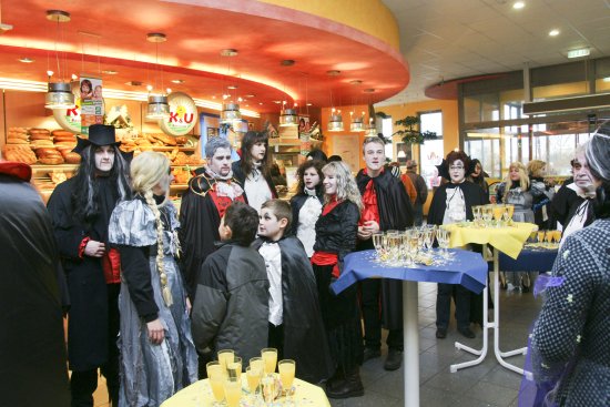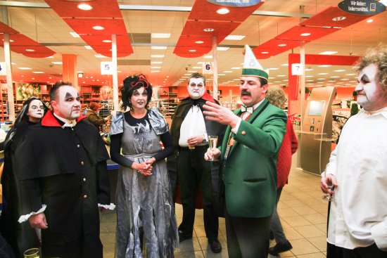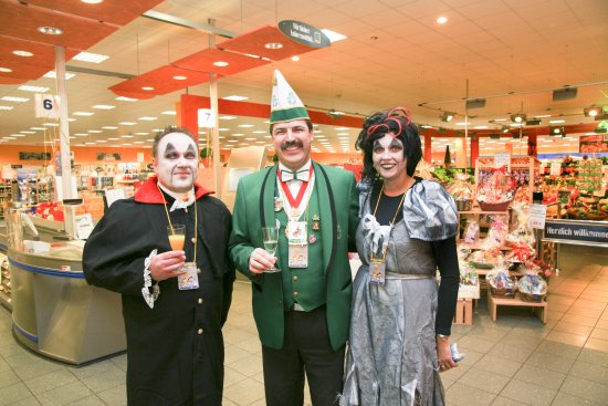 Nach einer kurzen Nacht trafen sich am Dienstag morgen die Akteure der KGR im Aktivmarkt Fitterer in der schaurig schönen Vampirsverkleidung. Roland Fitterer - selbst aktiver Fasenachter im badischen Haimbach - hatte die Karnevalisten auch in diesem Jahr eingeladen, um ihnen für die Teilnahme am Herxheimer Fastnachtsumzug noch einiges an Proviant mitzugeben und mit einem Umtrunk zu stärken.