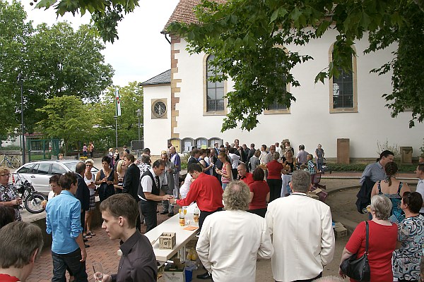 Das in Rülzheim sich trauende Paar besteht aus der Tochter des Träger des Golden Löwen mit Brillant, Willi Kupper, nämlich Heike und dem Sohn des 2. Vorsitzenden Bernd Fischer, nämlich Florian. Dieser ist schon seit einigen Jahren im Beirat der Stecher und unterstützt durch sein handwerkliches Geschick viele Aufbauarbeiten. Heike und Florian gaben sich in der Mauritiuskirche das Ja-Wort und der Beirat durfte beim Empfang nach der Trauung natürlich nicht fehlen. Bei einem kleinen Umtrunk unter der Platane konnte dem glücklichen Paar die guten Wünsche ausgesprochen werden. Auch hier noch mal an alle glücklich Vermählten die besten Wünsche von den Stechern.