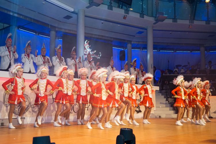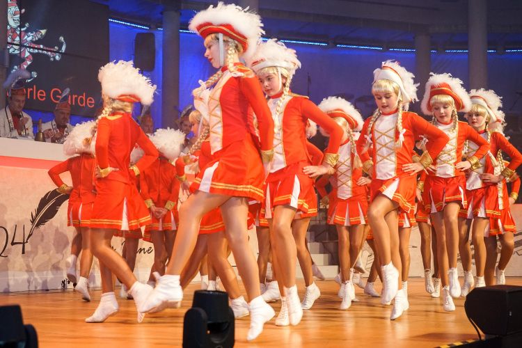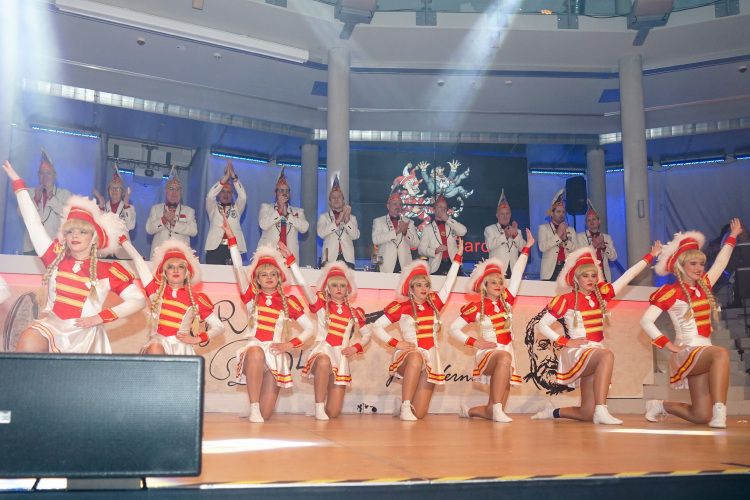 Kurz darauf zeigte die Juniorengarde ihren diesjährigen Gardetanz und wurde mit einem lang anhaltenden verdienten Applaus belohnt. Trainiert werden die sportlichen jungen Frauen von Selina Weiler. Nachdem Sitzungspräsident Haag die befreundeten Vereine aus Kuhardt, Hördt, Leimersheim, Jockgrim und der BG Heimbach begrüßte, wurde es auch schon Zeit für die erste Schunkelrunde des Abends. Zur Überraschung der Gäste übernahm Prinz Tobias I. die Leitung der Kapelle, während Henric Franck zusammen mit der Prinzessin sang.