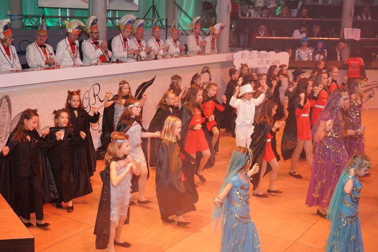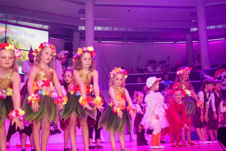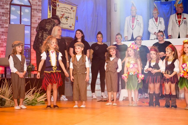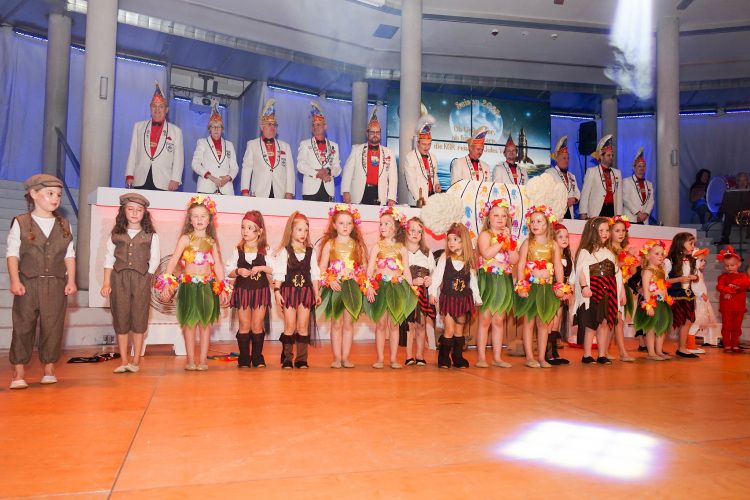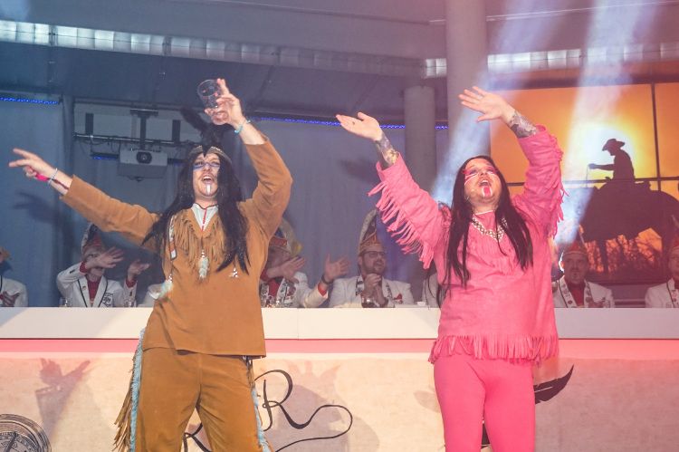 Anschließend ergatterten die von Jessica Gröbel und Celine Hammer trainierten Minis und Bambinis mit ihrem zauberhaften Schautanz „Die geheimnisvolle Insel“ die erste Zugabe des Abends. Mit Hits wie „Hula Hoop“ und „Waka Waka“ tanzten sich die jüngsten KGR-Mitglieder in die Herzen der Zuschauer. Danach begeisterten die Zwillings-Indianer Winnetütü und Winnedubbe, gespielt von Patrick und Timo Oßwald, auf der Suche nach der einmaligen pfälzischen Schorle-Quelle, das Publikum. Als die Reise der beiden dann beinahe über den Rhein nach Baden-Württemberg ging, war das Gelächter im Saal groß.