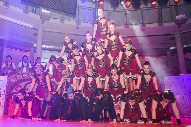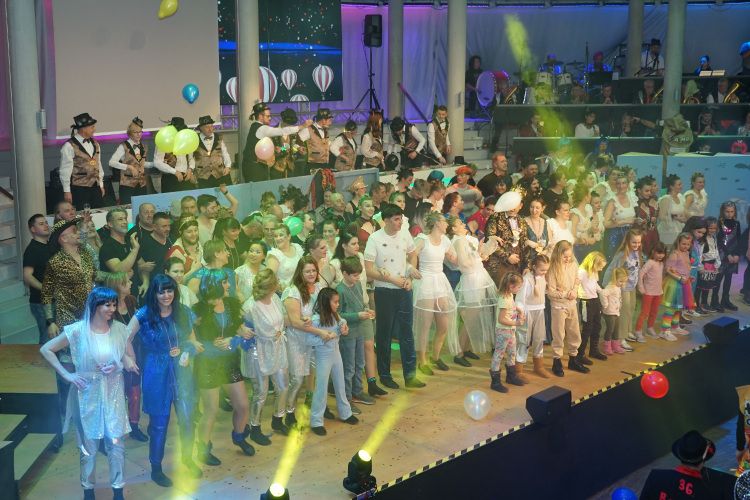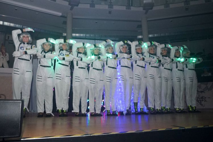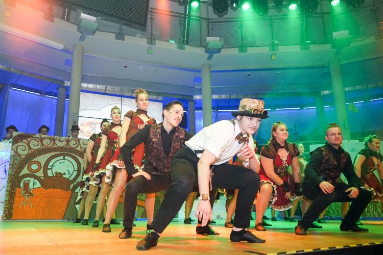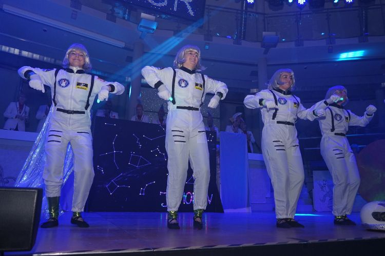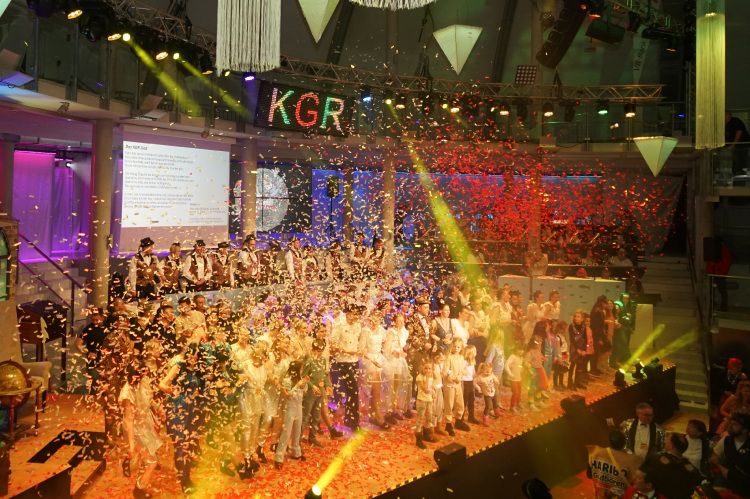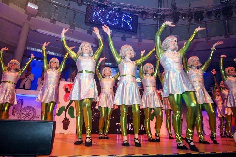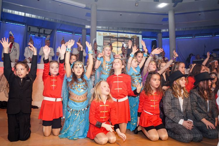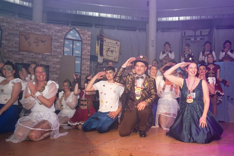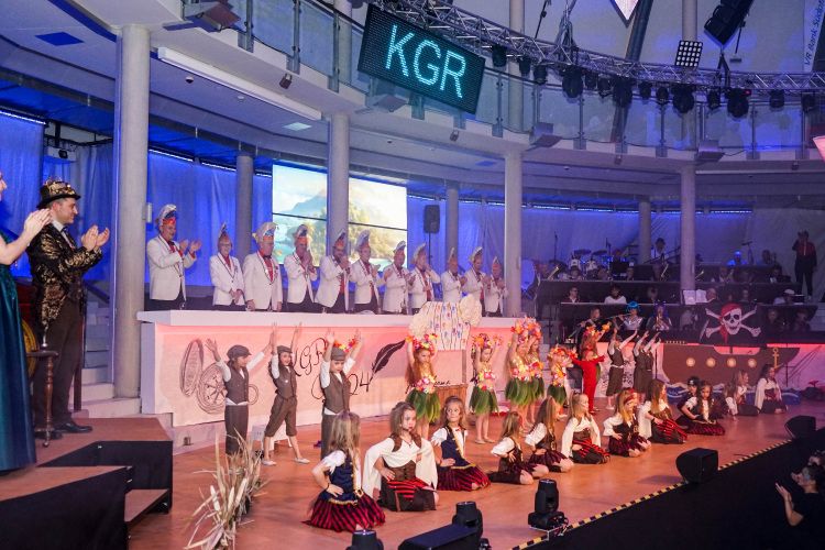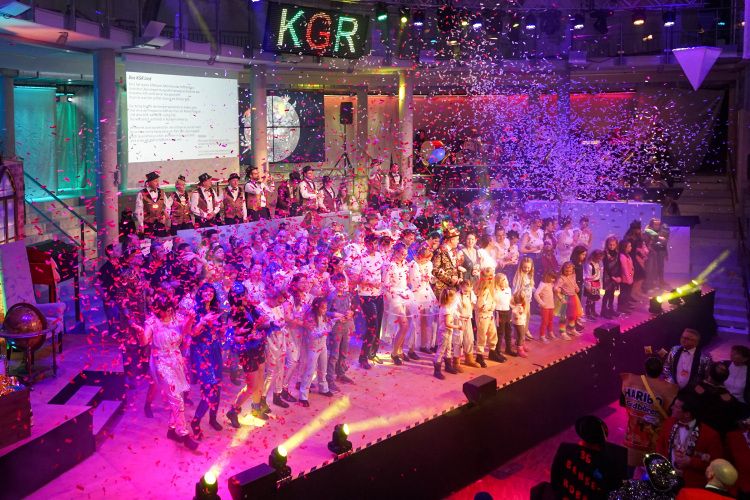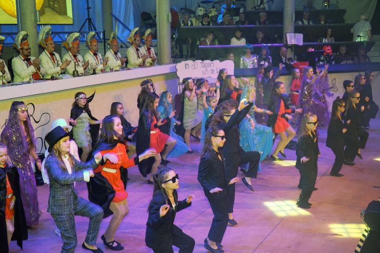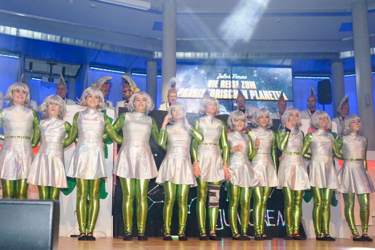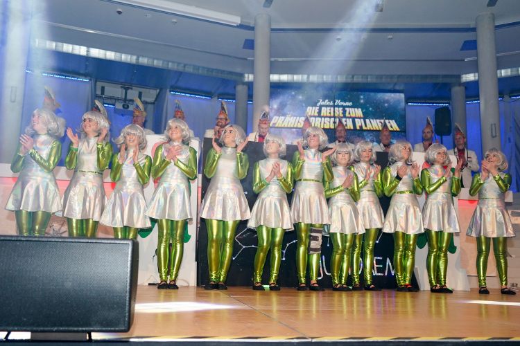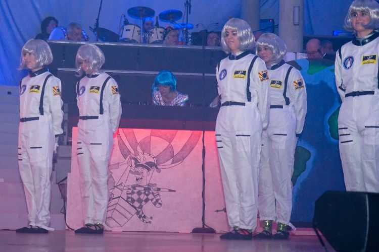 Als nächstes war der Schautanz der Stecherle „In 80 Tagen um die Welt“ an der Reihe, der die Zuschauer durch die choreografischen Elemente, das zauberhafte Bühnenbild und den großartigen Kostümen von den Stühlen riss. Trainerinnen Celine Reichling und Victoria Tkotz freuten sich über die wohl verdiente Zugabe. Nachdem KGR-Urgestein Simone Kerner als Lehrerin auf der Bühne für einige Lacher sorgte und auch Ortsbürgermeister Reiner Hör an ihrem Mathematik-Unterricht teilnehmen musste, sorgten die Junioren mit ihrem Schautanz „Die Reise zum prähistorischen Planeten“ für große Begeisterung im Publikum. Verantwortlich für den hervorragenden Auftritt mit Hits wie „Major Tom“ inklusive sensationellen Lichteffekten waren Yasmin Yam und Hannah Emrich.