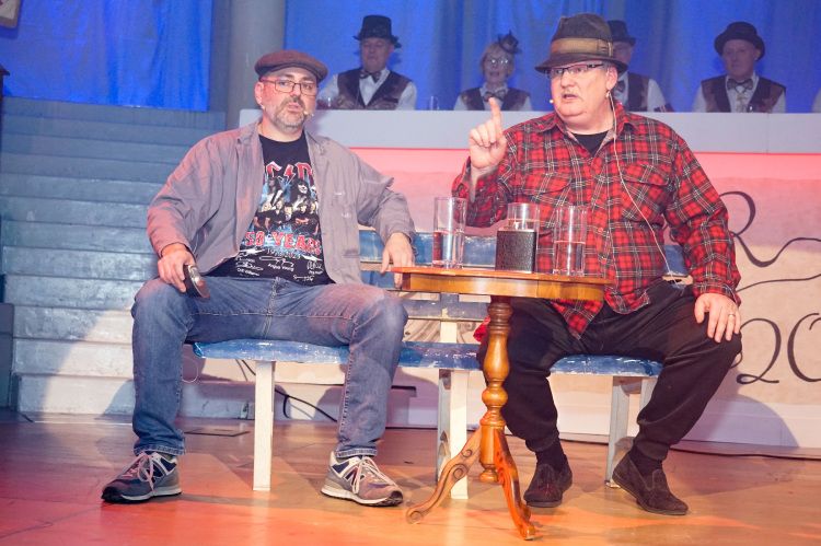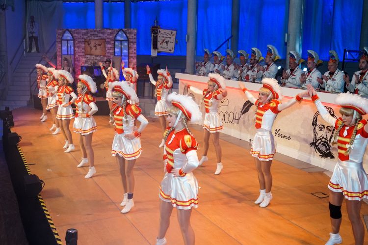 Für viel Gelächter sorgten danach Büttenredner Fabian Metz & Christian Koch, während sie auf einer Bank hockten, über Gott und die Welt sprachen und sich gegenseitig mit „dummen Sprüchen“ ergänzten. Nachdem die Roten Husaren noch einmal den Saal mit Stimmungsmusik füllten, ging es zum letzten großen Programmpunkt des Abends: Der Schautanz der Stechergarde.